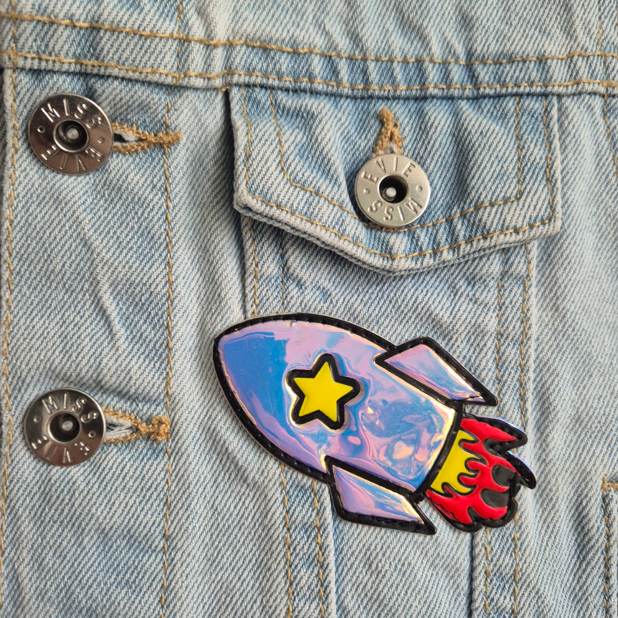 A magnificent wolf patch, perfect for any adventure in the city or the wilderness. Topped off with a shiny rocket and handy french fries for hunger pangs, this jacket will protect you whatever comes your way!