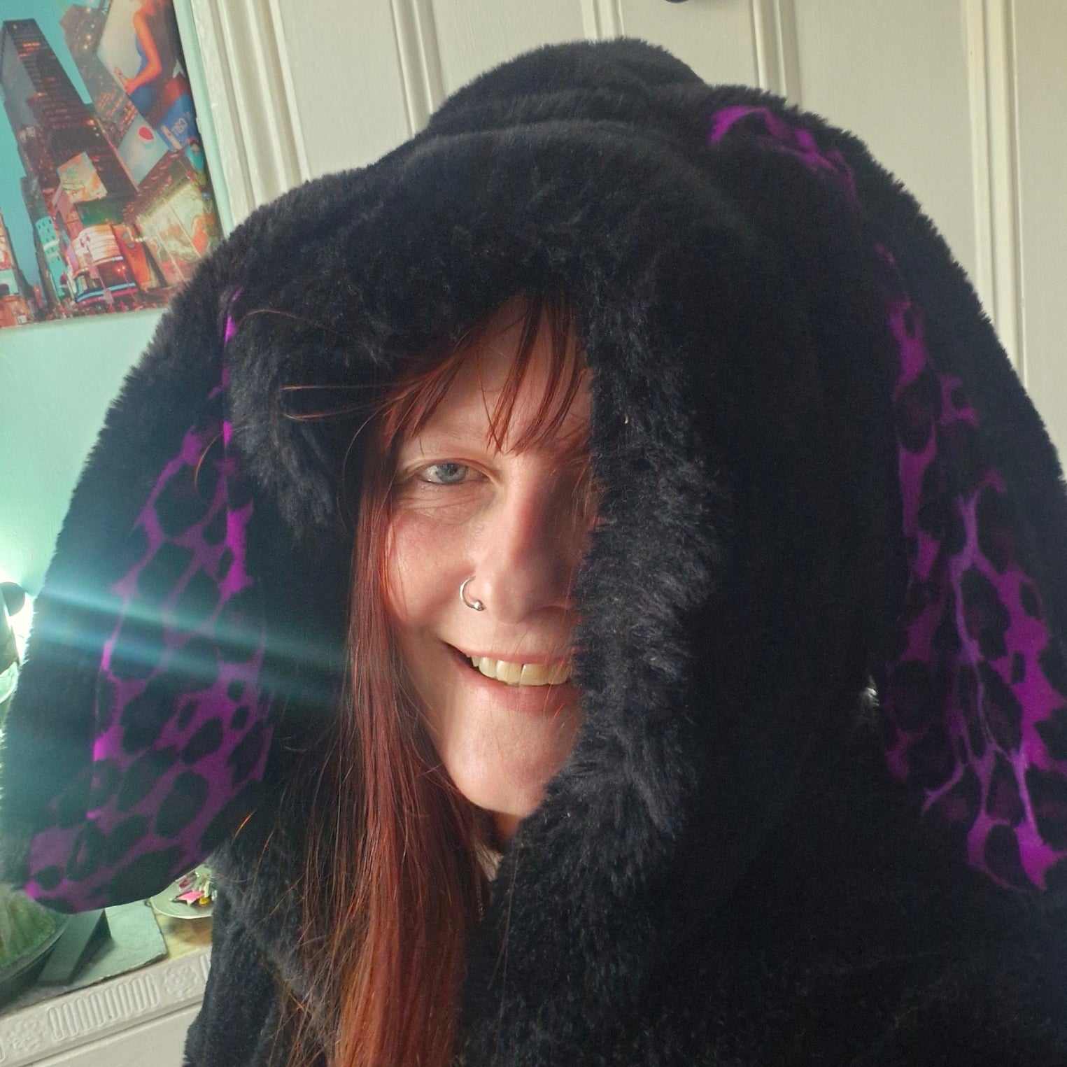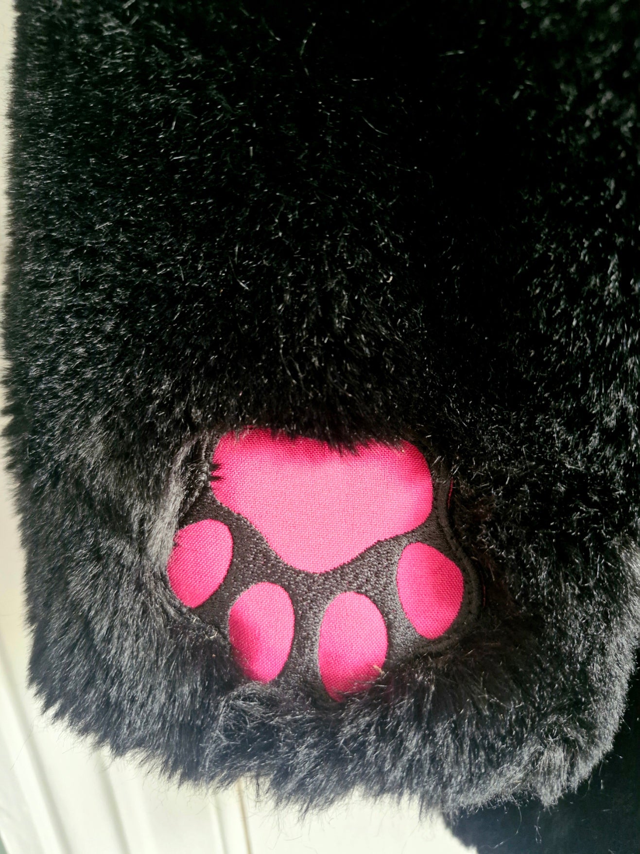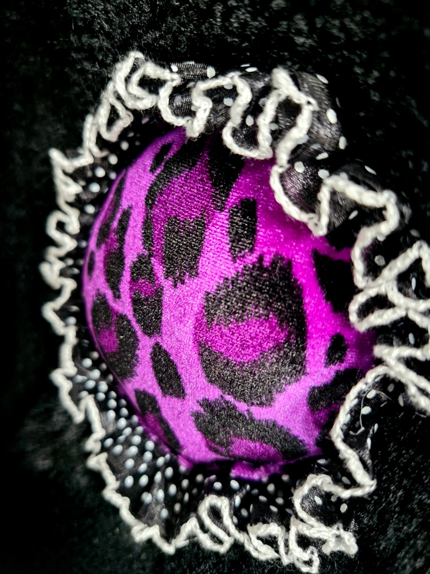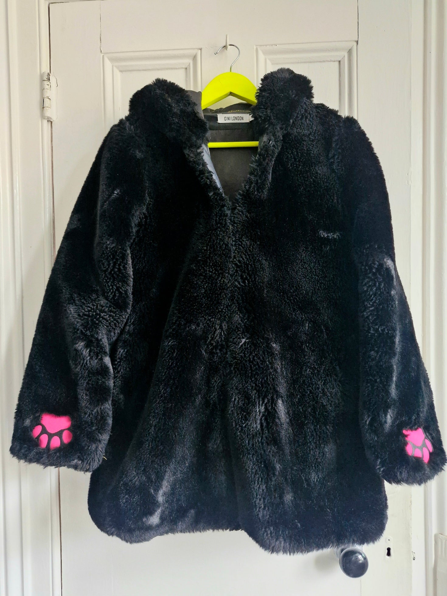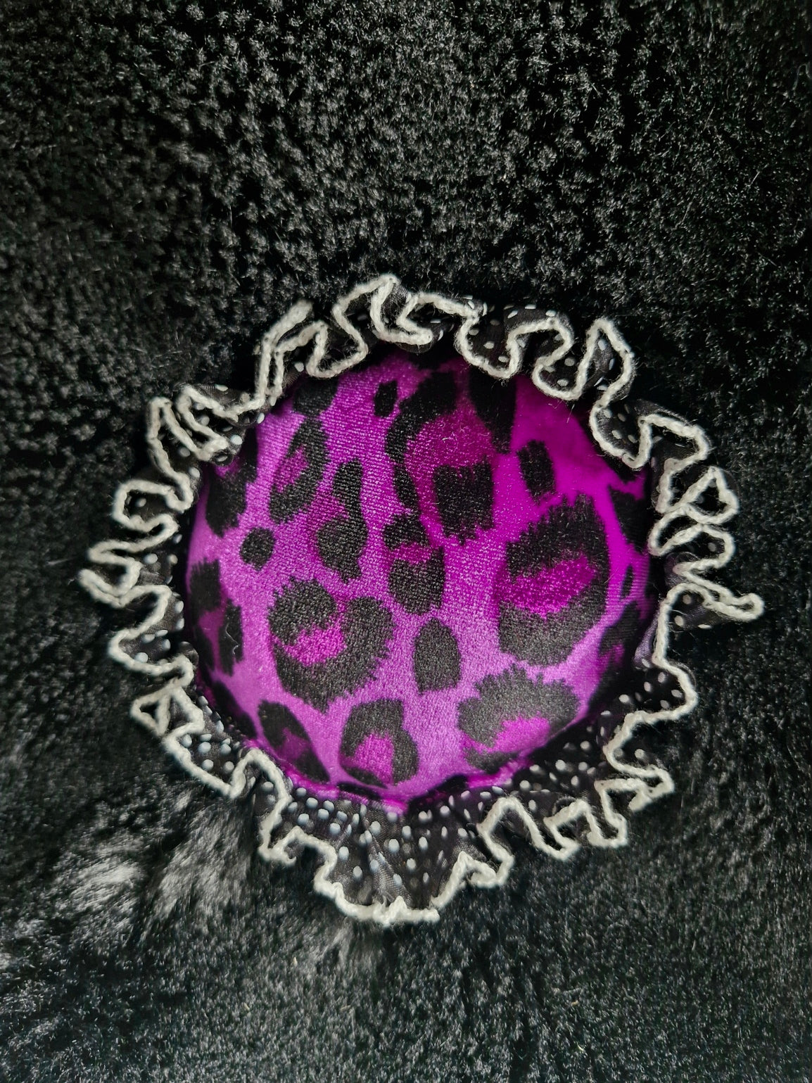 This is a heavyweight of a coat. its thick plush black fur, and part of the lining trim is a leatherette so you can really feel you're wearing a powerful coat. In great condition and embellished with a top luxe purple leopard velour on the ears and tail. Fastens with five hook and eye clasps down the front.
