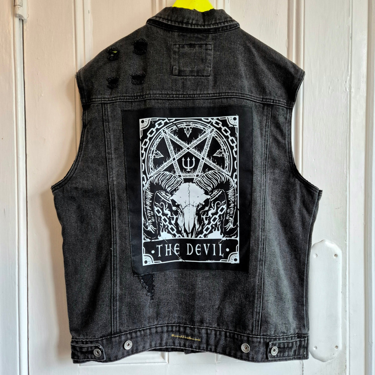 Great over sized black battle jacket. Reworked from a Silent Theory XXL pre distressed denim jacket, by removing the sleeves and adding an awesome graphic 'The Devil' back patch, with an extra skull and grim reaper patch on the front. Distressing as shown in the pictures, make this an excellent dark jacket.