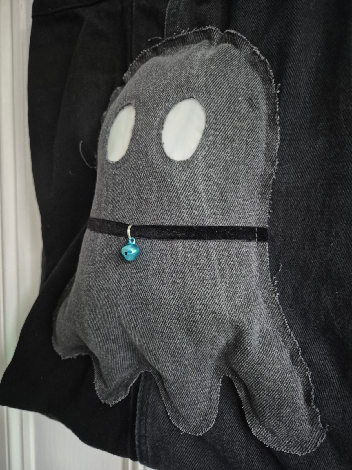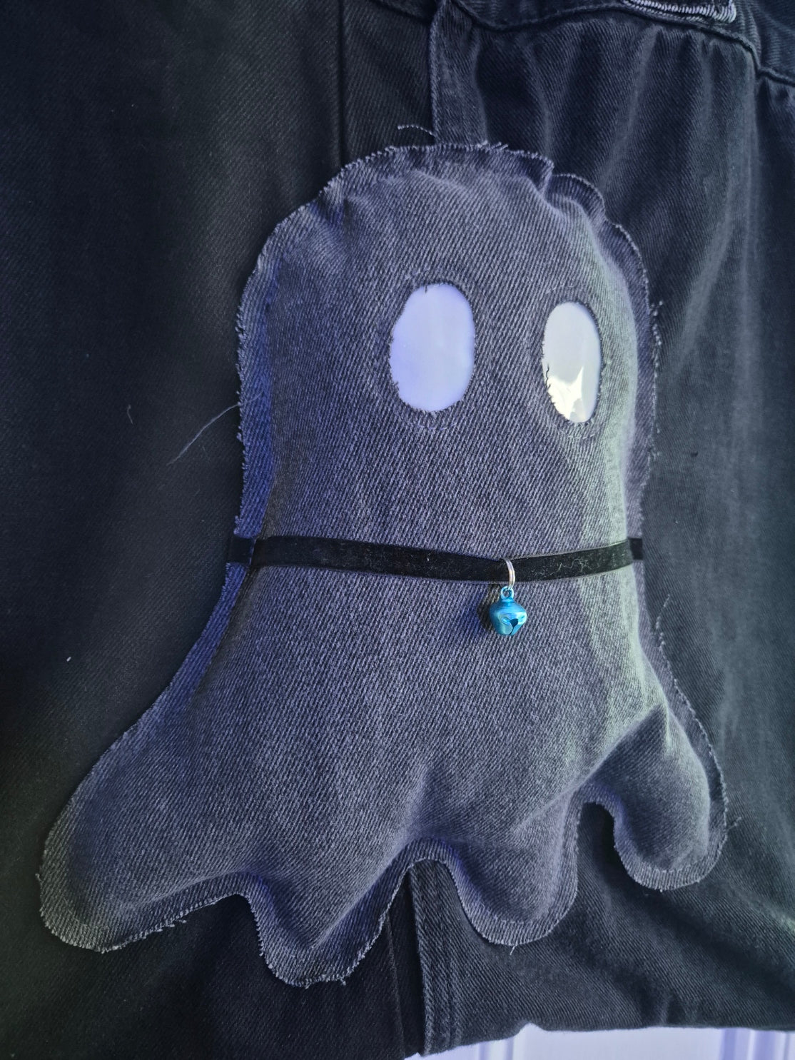And all in the most sustainable way! Made using denim sleeves which have been cut off many battle jackets, buttoned to each other at the cuffs. The plush ghost is from another sleeve and stuffed with the softest stuffing, made from recycled plastic bottles. Add a pair of glowing eyes and tinkling bell, with some more cuffs making up the handle, and BOOF - spooky cuteness guarrenteed!