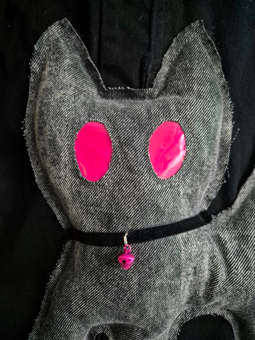 And all in the most sustainable way! Made using denim sleeves which have been cut off many battle jackets, buttoned to each other at the cuffs. The adorable kitty is from another sleeve and stuffed with the softest stuffing, made from recycled plastic bottles. Add a pair of glowing eyes and tinkling bell, with some more cuffs making up the handle, and BOOF - kitty cuteness guarrenteed!
