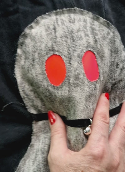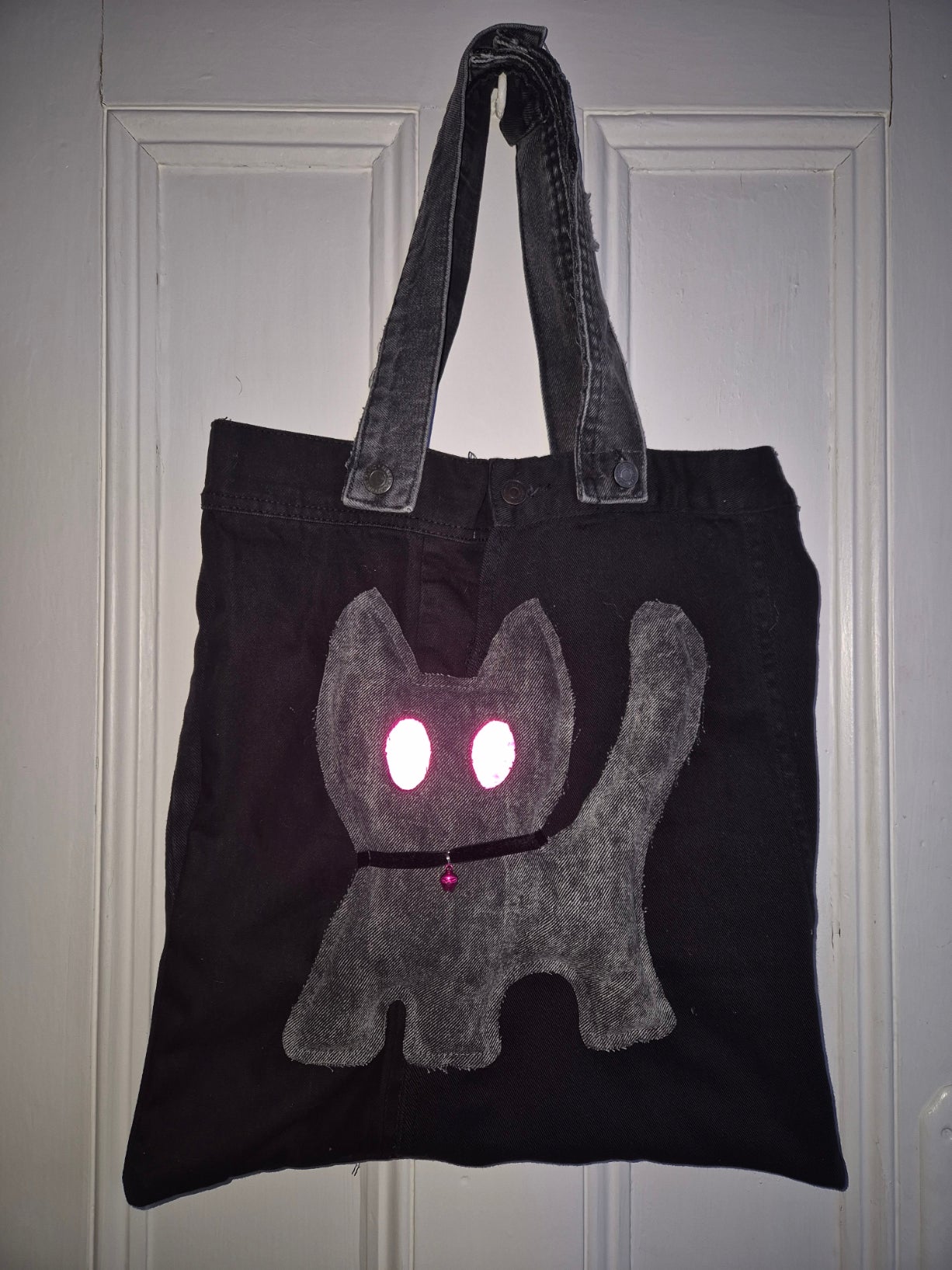 And all in the most sustainable way! Made using denim sleeves which have been cut off many battle jackets, buttoned to each other at the cuffs. The adorable kitty is from another sleeve and stuffed with the softest stuffing, made from recycled plastic bottles. Add a pair of glowing eyes and tinkling bell, with some more cuffs making up the handle, and BOOF - kitty cuteness guarrenteed!