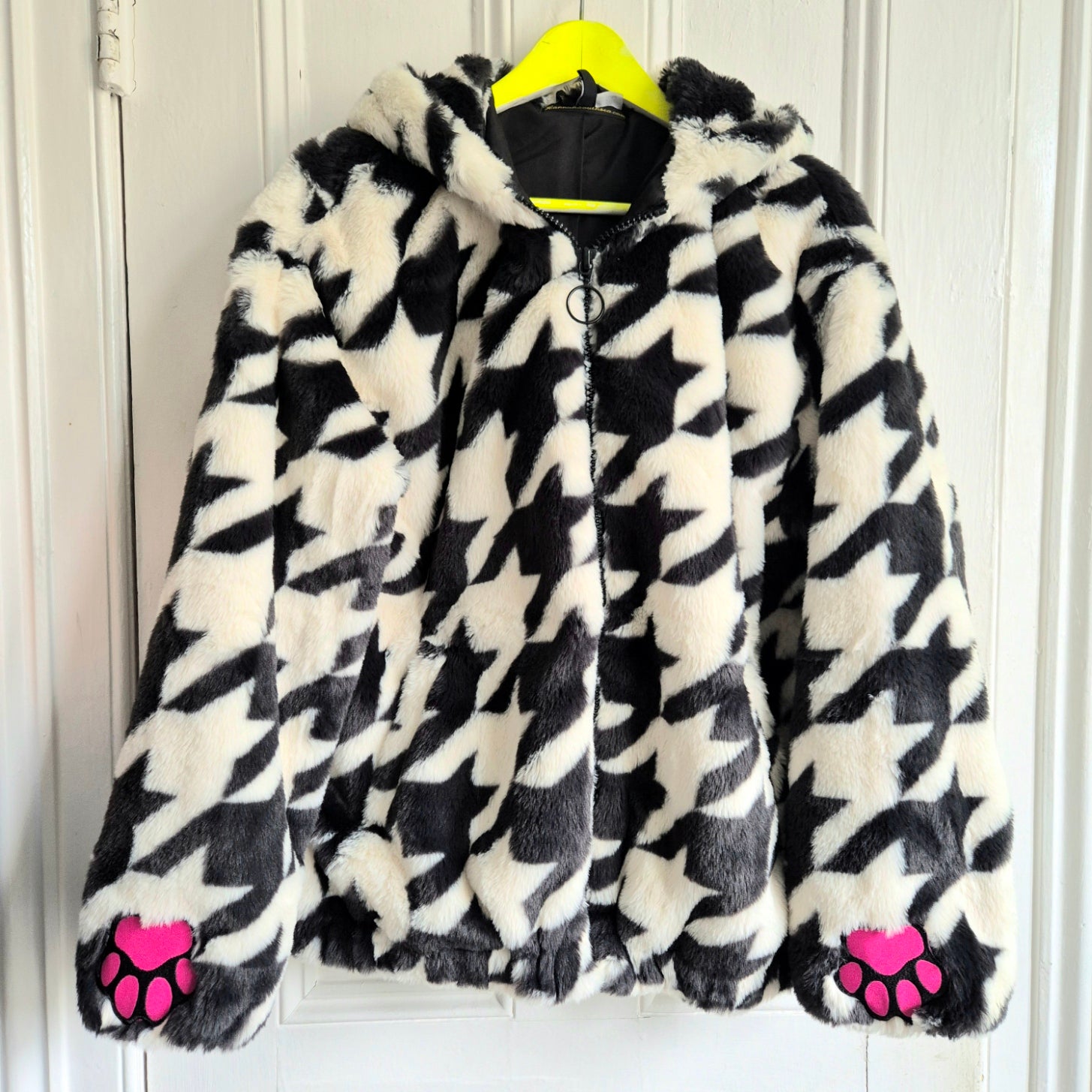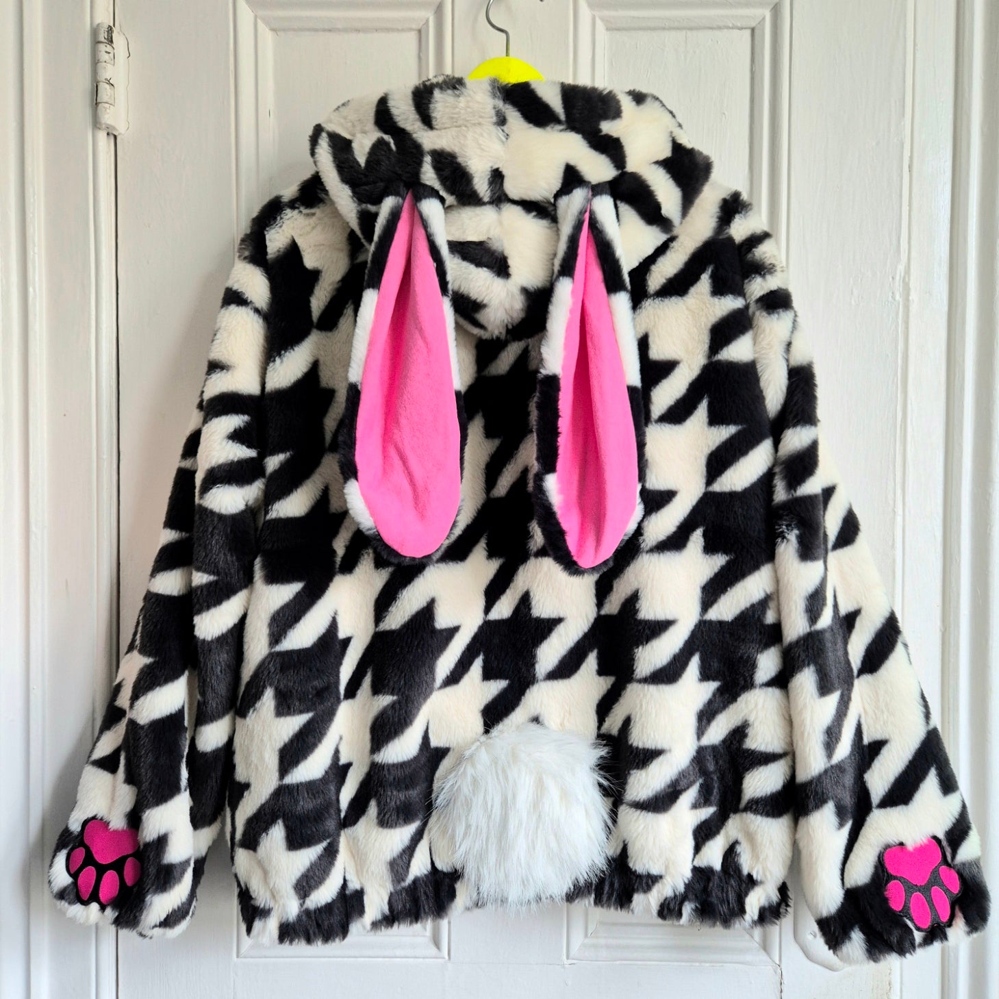 With the softest fur imaginable, this super cool houndstooth design with pink accents, will get you noticed in any urban or countryside setting. An H&M remake, featuring organic pink fleecy ears, pink paws and an extra floofy white tail, this is a super snuggle rabbit hide out!