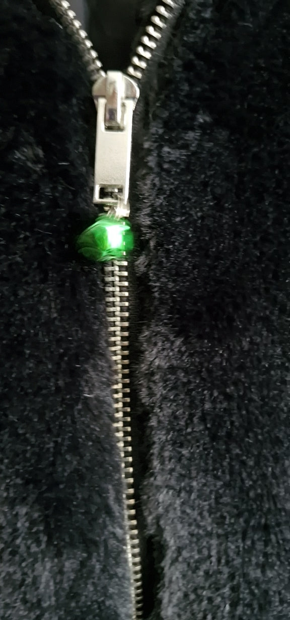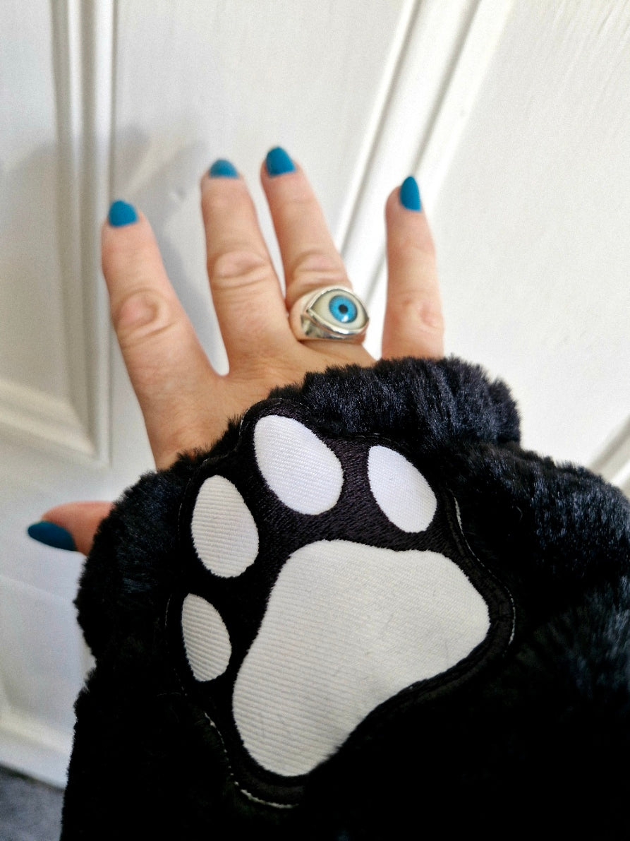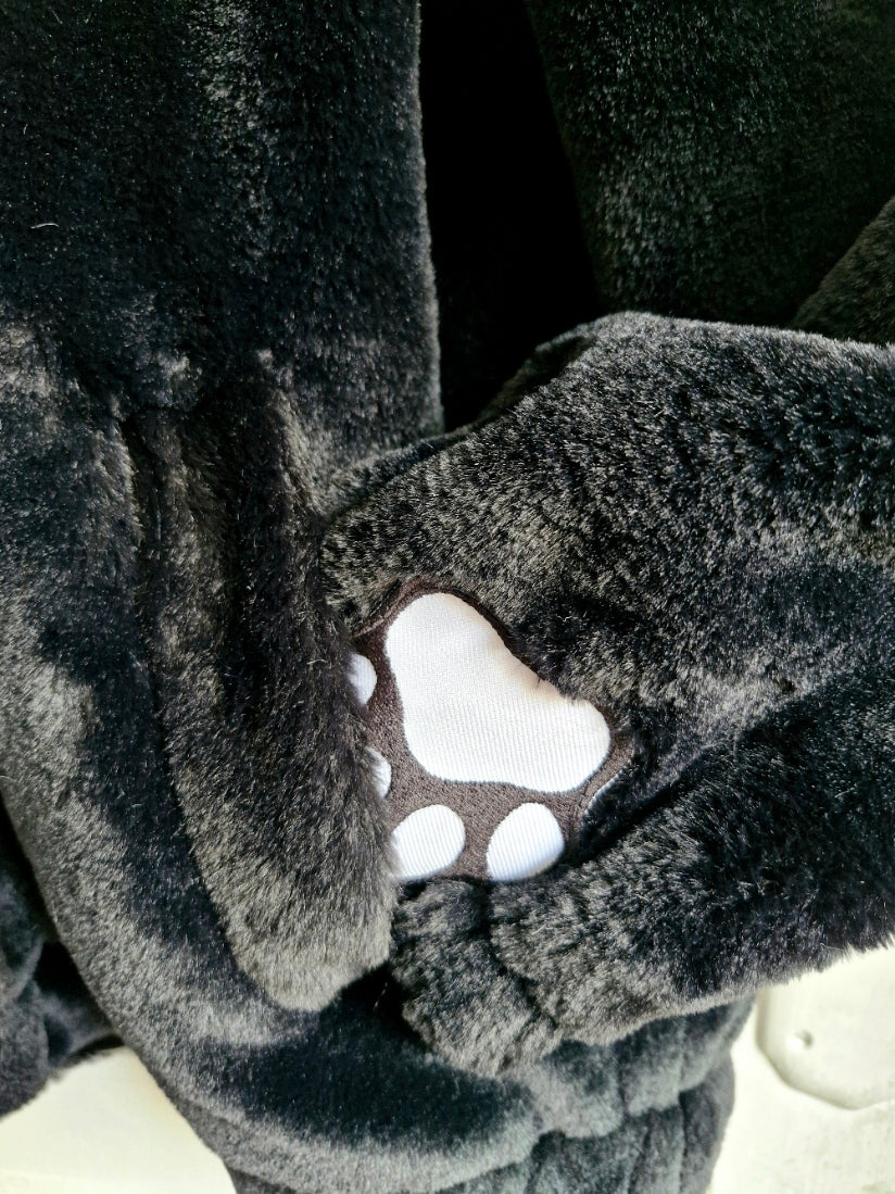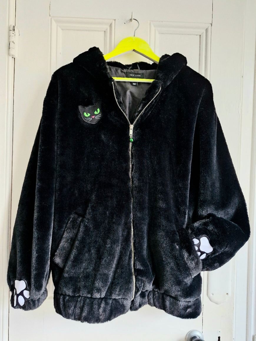 One of the softest kittys in town! Beautiful condition reworked New Look faux fur hooded jacket, fully lined, which really is one of the softest furs in town. Completely repurposed with hand sewn furry ears, purrfect paws, embroidered in the uk, and a tiny tinkly bell to forewarn of any upcoming mischief! Oh and a green eyed kitty patch for extra cat involvelment.