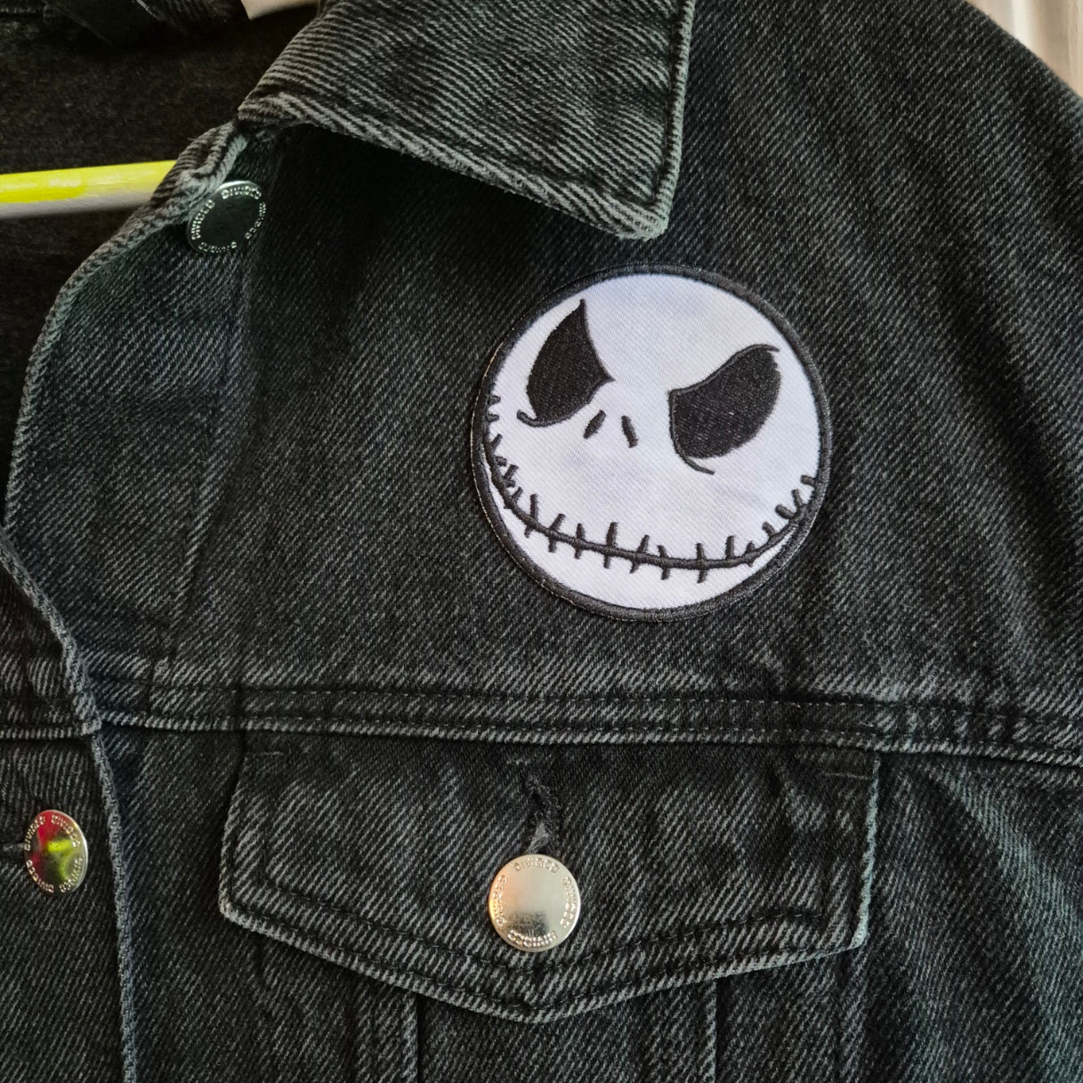 Battle jacket reworked from an H&M denim jacket. Generously sized and with a full ouija back patch finished off with black tape and D-rings. Front patches are a jack Skellington and a detailed celtic cross.
